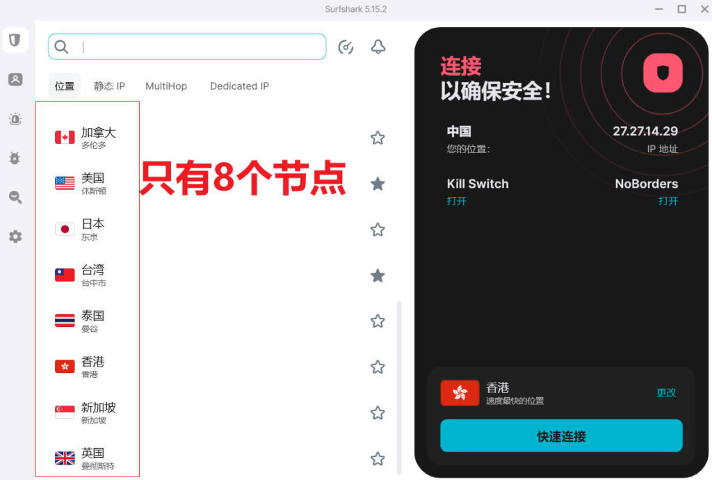 现在surfshark 最新版本电脑端和手机端上,可供选择节点只有8个了!!!这个就是最大的问题,即便8个地区节点都能连上,但是服务器数量还是太少了!还不说很多时候这些节点不能保证都能成功连接上!所以2025年5月Surfshark(冲浪鲨鱼)在中国可以弃用了!