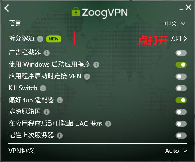 不过需要将 ZoogVPN windows 程序升级到最新版本,升级到最新版为7.0.0.5后,zoogvpn会看到新增加功能。