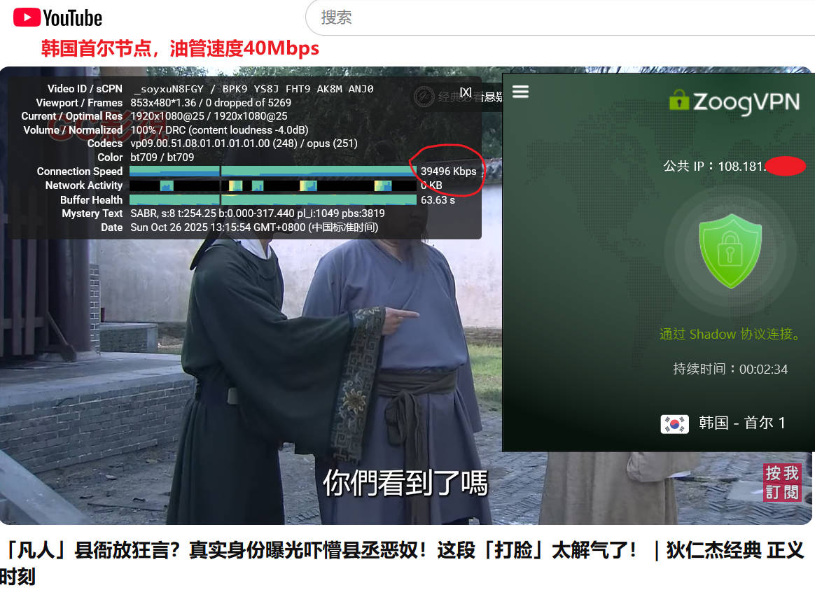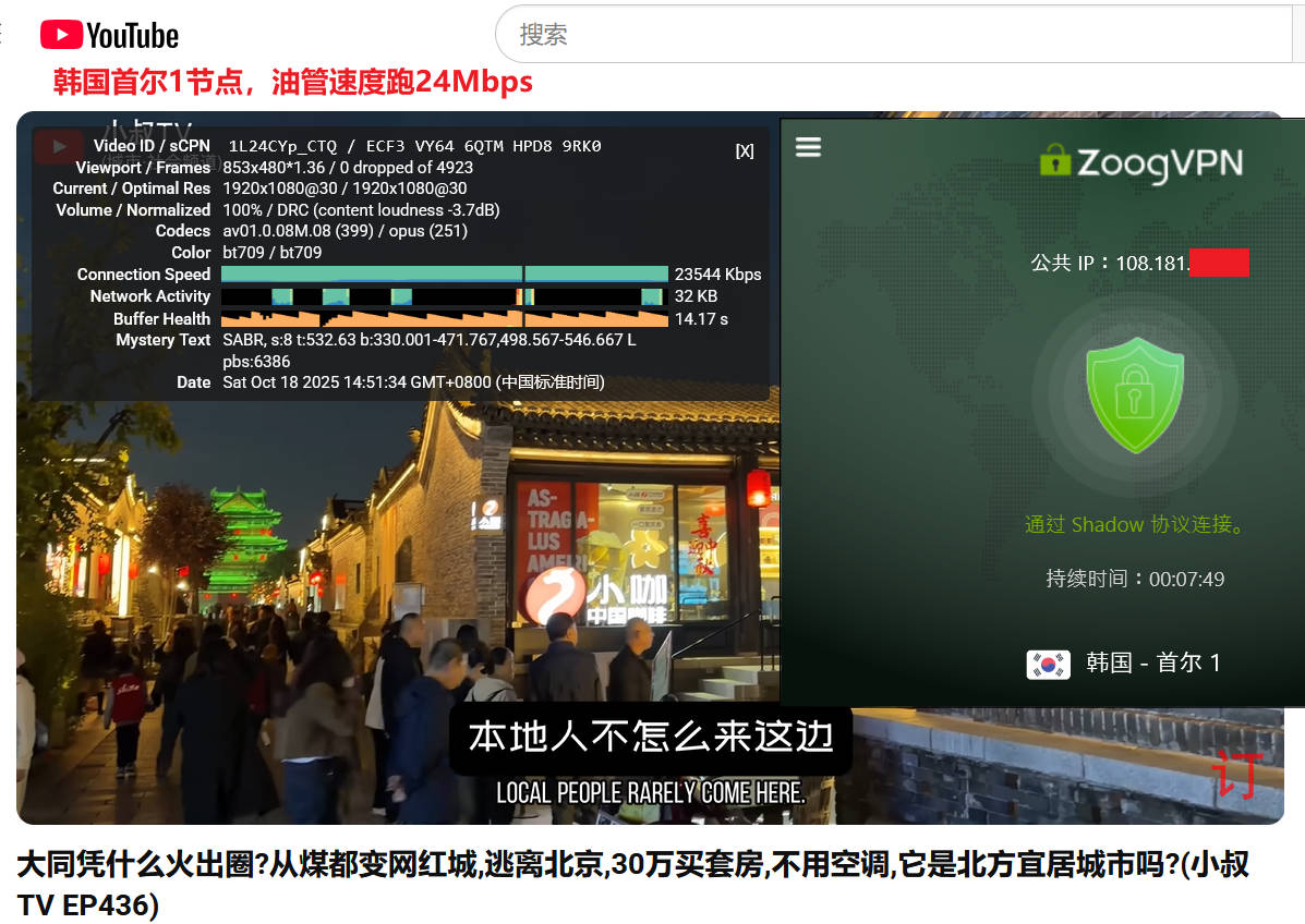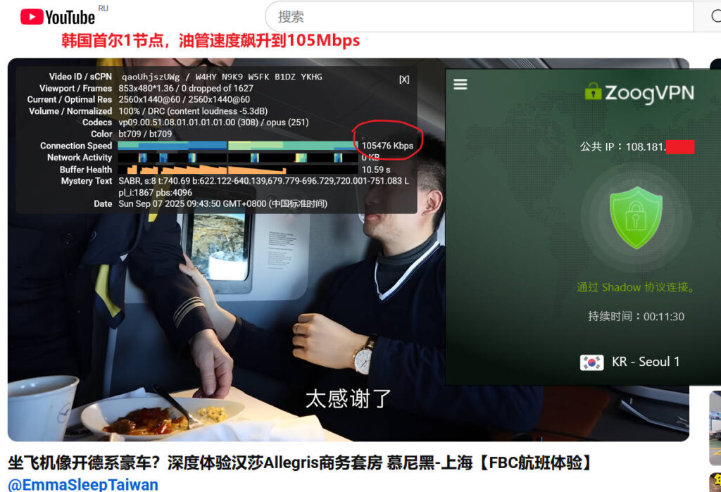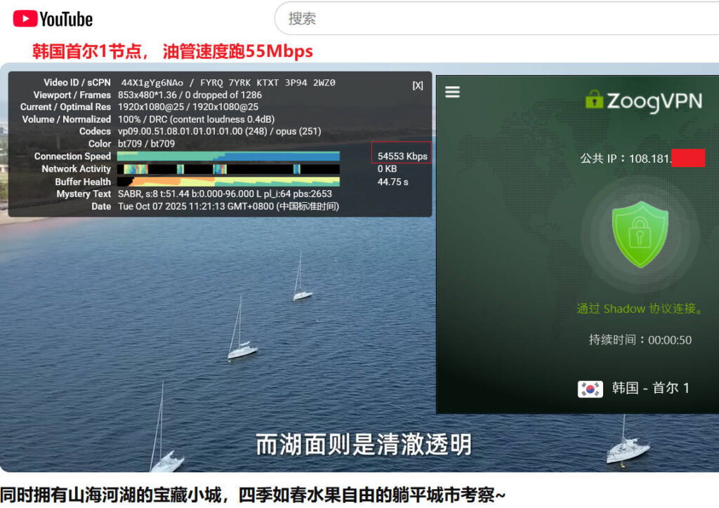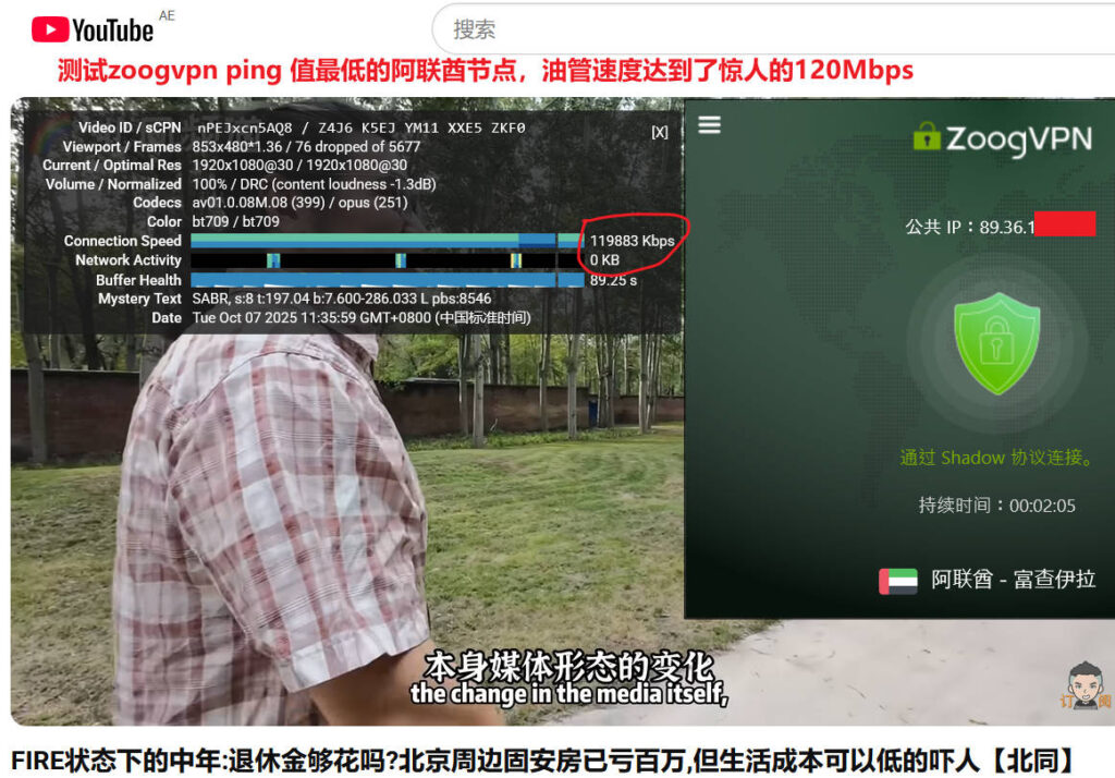 10月7日上午,电信wifi下,先后测试了韩国、香港和阿联酋三个节点,连接协议都是默认的shadow协议,油管速度分别跑55Mbps、82Mbps 、120Mbps,其中香港视频选择的2160P 4K超高清视频,播放非常流畅!而因为新版zoogvpn上,阿联酋ping 值显示的最低,表示网络连通更顺畅,就测试连接了阿联酋节点,油管速度飙升到120Mbps, 非常给力!如下图所示