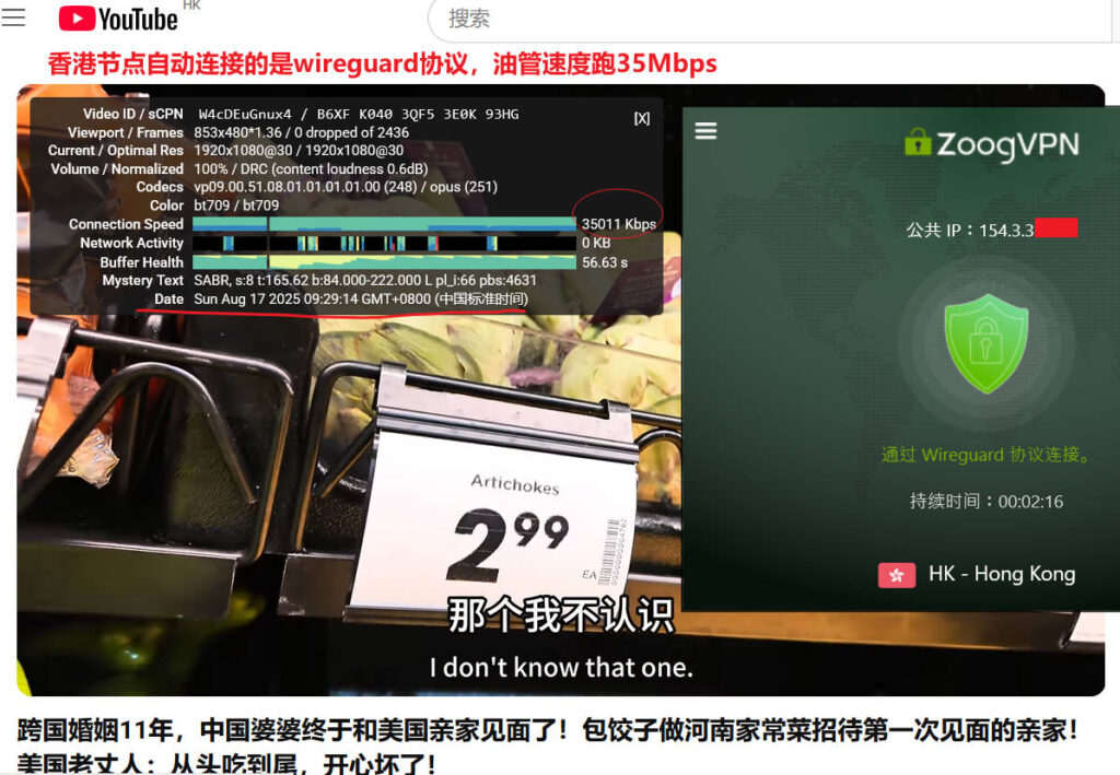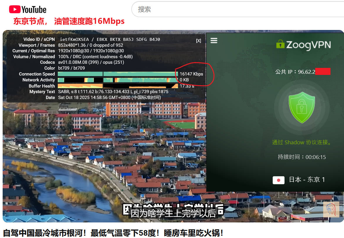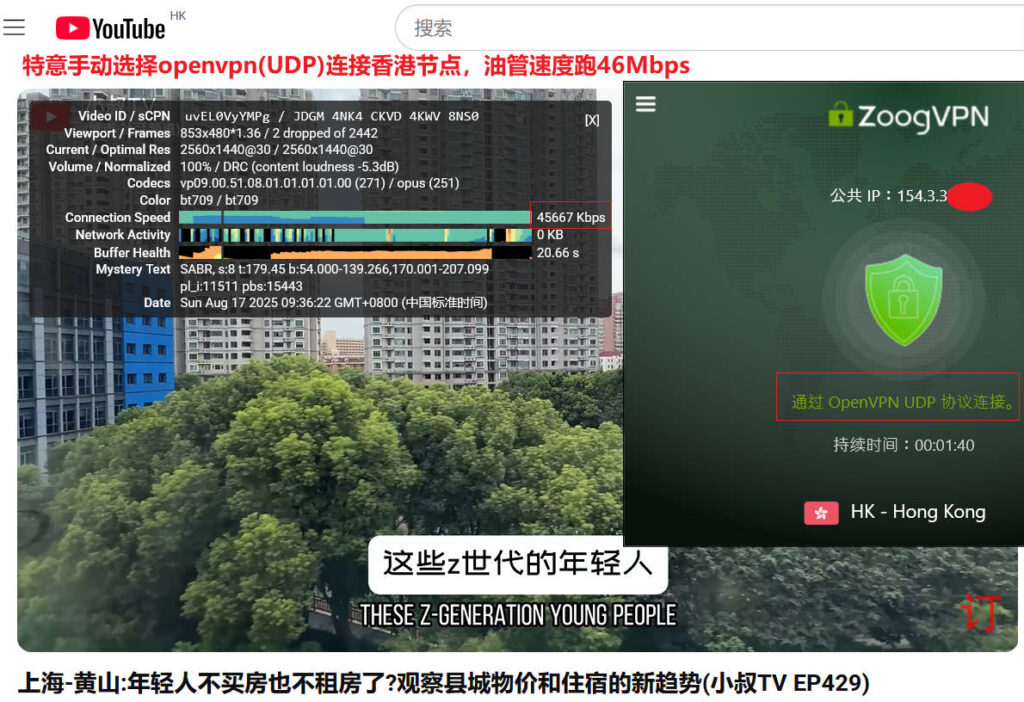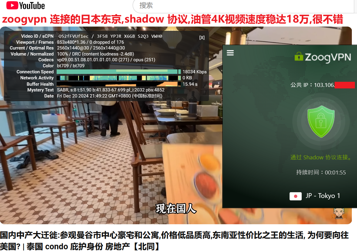 10月7日上午,电信wifi下,先后测试了韩国、香港和阿联酋三个节点,连接协议都是默认的shadow协议,油管速度分别跑55Mbps、82Mbps 、120Mbps,其中香港视频选择的2160P 4K超高清视频,播放非常流畅!而因为新版zoogvpn上,阿联酋ping 值显示的最低,表示网络连通更顺畅,就测试连接了阿联酋节点,油管速度飙升到120Mbps, 非常给力!如下图所示