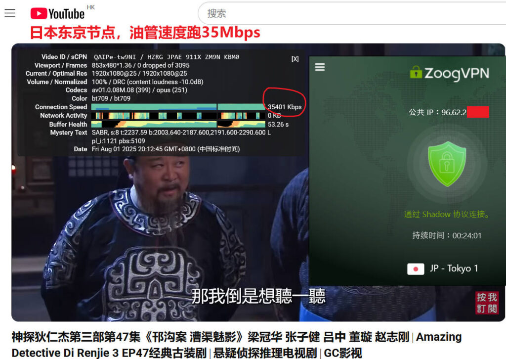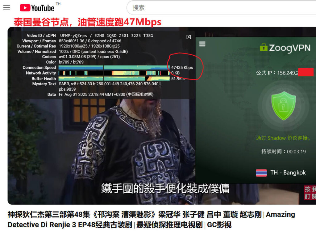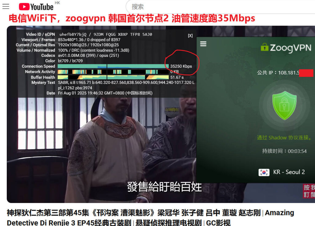 8月1日晚上,电信wifi下,先后测试了韩国首尔2、日本东京、泰国曼谷三个节点,三个节点连接协议都是默认的shadow协议,油管速度分别跑35Mbps、35Mbps、47Mbps,非常给力!如下图所示