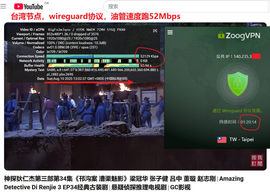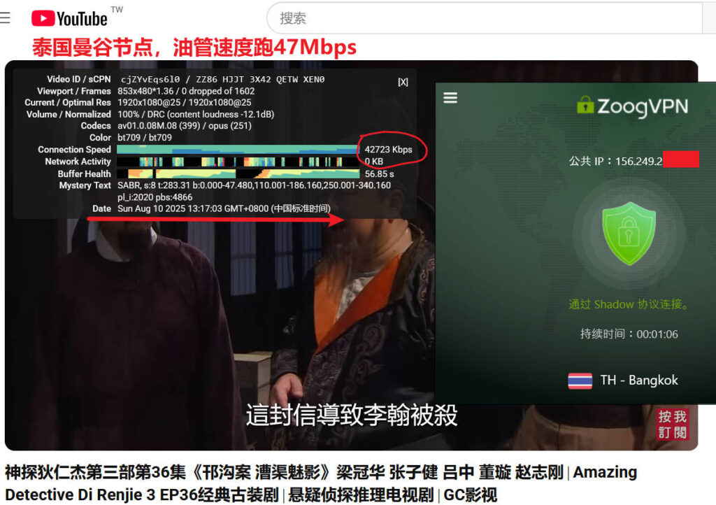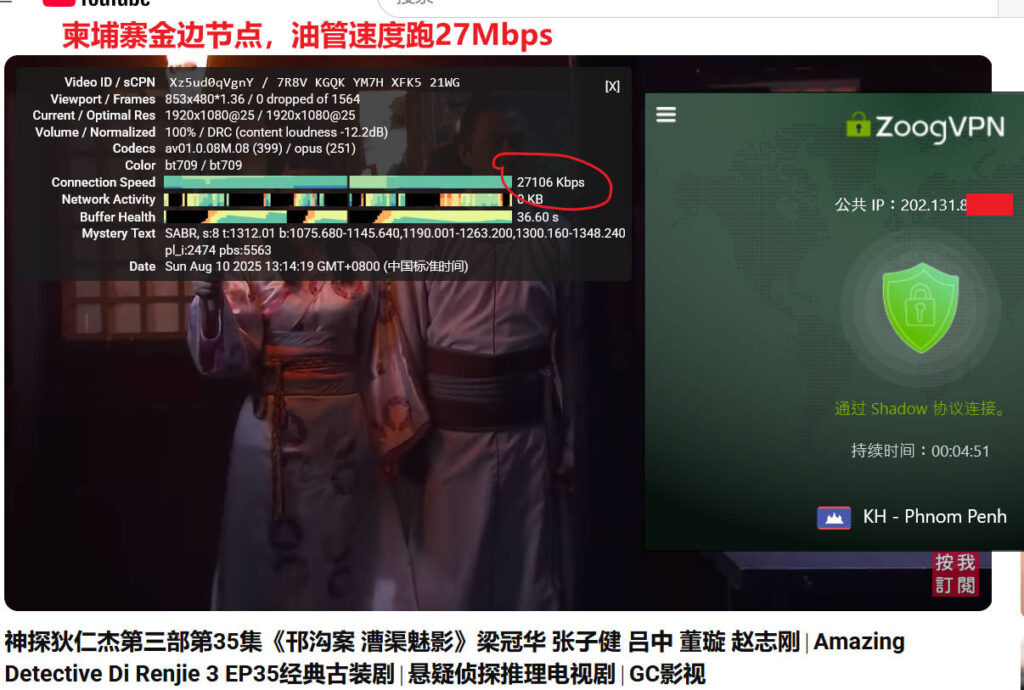 8月10日中午,电信wifi下,先后测试了台湾台北、柬埔寨金边、泰国曼谷三个节点,台湾台北节点默认连接上的的wireguard协议,油管跑52Mbps,speedtest测试下载速度51Mbps、上传速度41Mbps,柬埔寨金边、泰国曼谷两个节点连接协议都是默认的shadow协议,油管速度分别跑27Mbps、47Mbps 非常给力!如下图所示