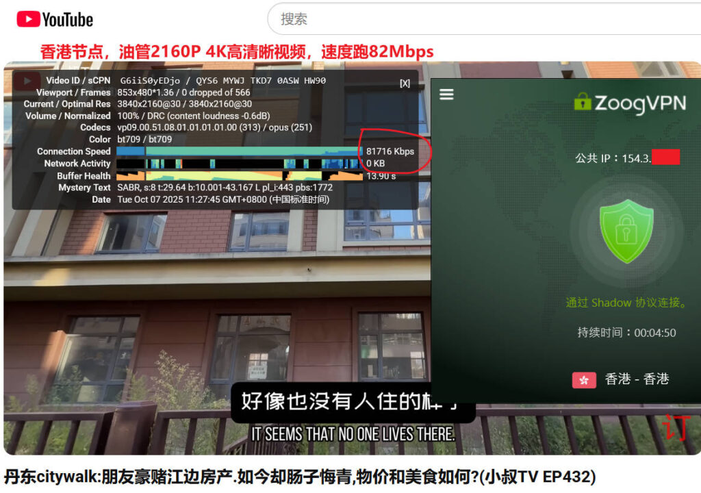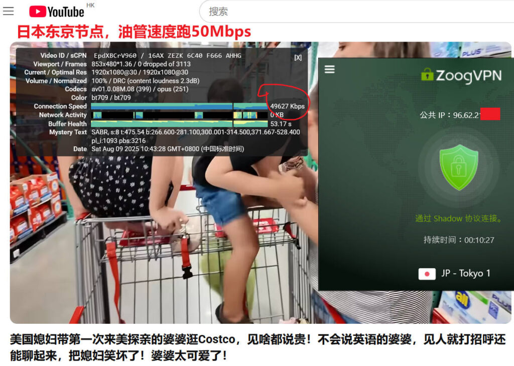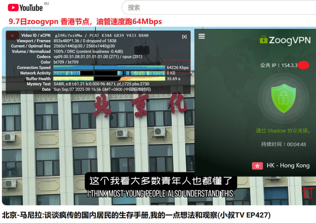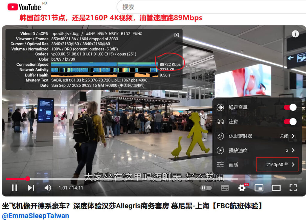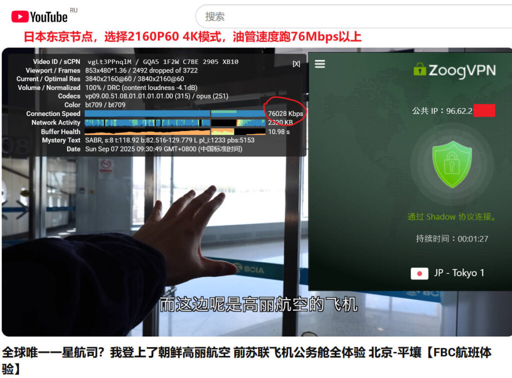 9月7日上午,电信wifi下,先后测试了香港、日本和韩国三个节点,连接协议都是默认的shadow协议,油管速度分别跑64Mbps、76Mbps 、89Mbps(偶尔跑到了105Mbps),其中日本和韩国视频都选择的2160P 4K超高清视频,播放非常流畅!非常给力!如下图所示