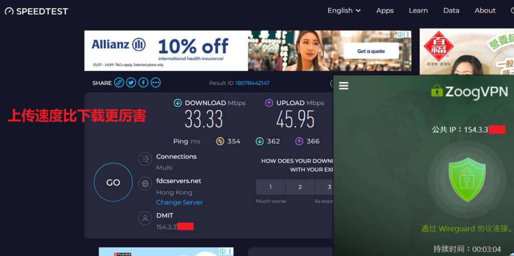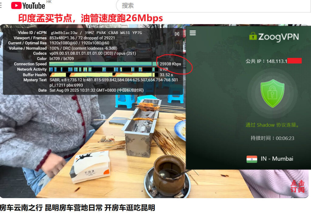 8月9日上午,电信wifi下,先后测试了香港、印度孟买、日本东京三个节点,香港节点默认连接上的的wireguard协议、speedtest下载速度33Mbps、上传速度46Mbps,印度孟买、日本东京两个节点连接协议都是默认的shadow协议,油管速度分别跑26Mbps、50Mbps 非常给力!如下图所示