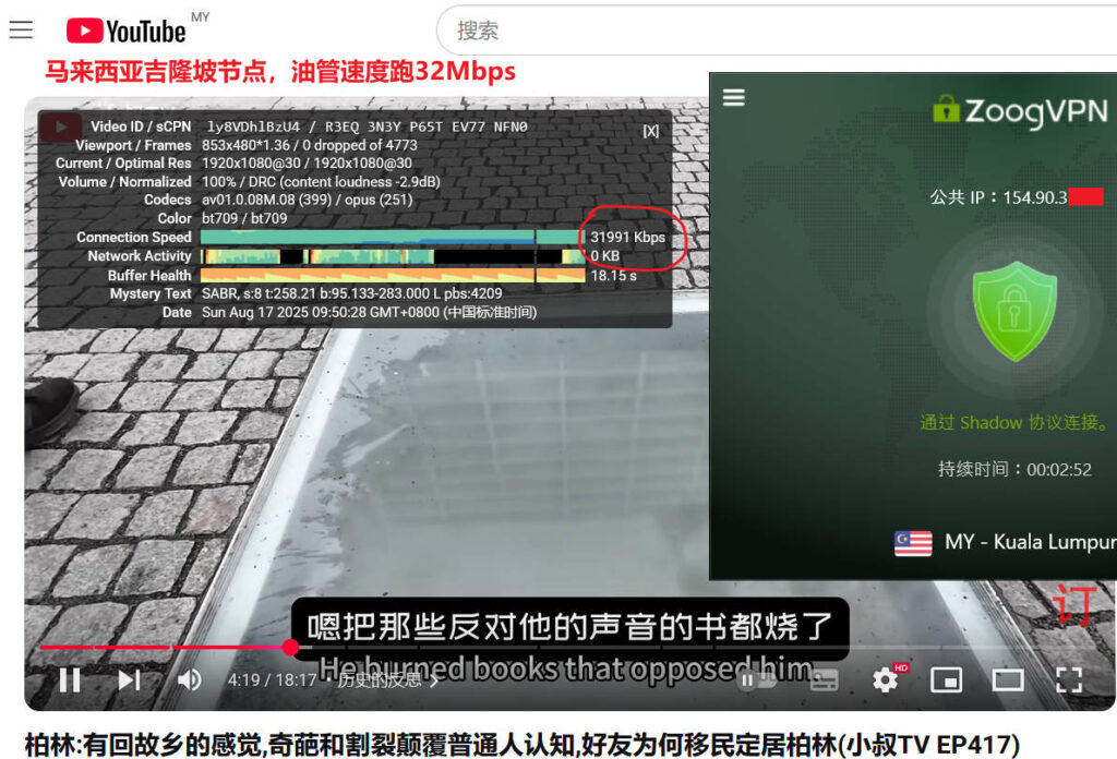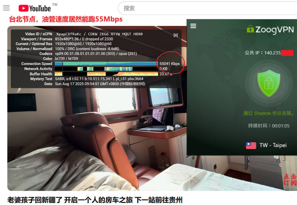 8月17日上午,电信wifi下,先后测试了香港节点wireguard协议、openvpn(TCP)协议,油管速度分别跑35Mbps、46Mbps。然后测试马来西亚吉隆坡、台湾台北两个节点,连接协议都是默认的shadow协议,油管速度分别跑32Mbps、55Mbps 非常给力!如下图所示