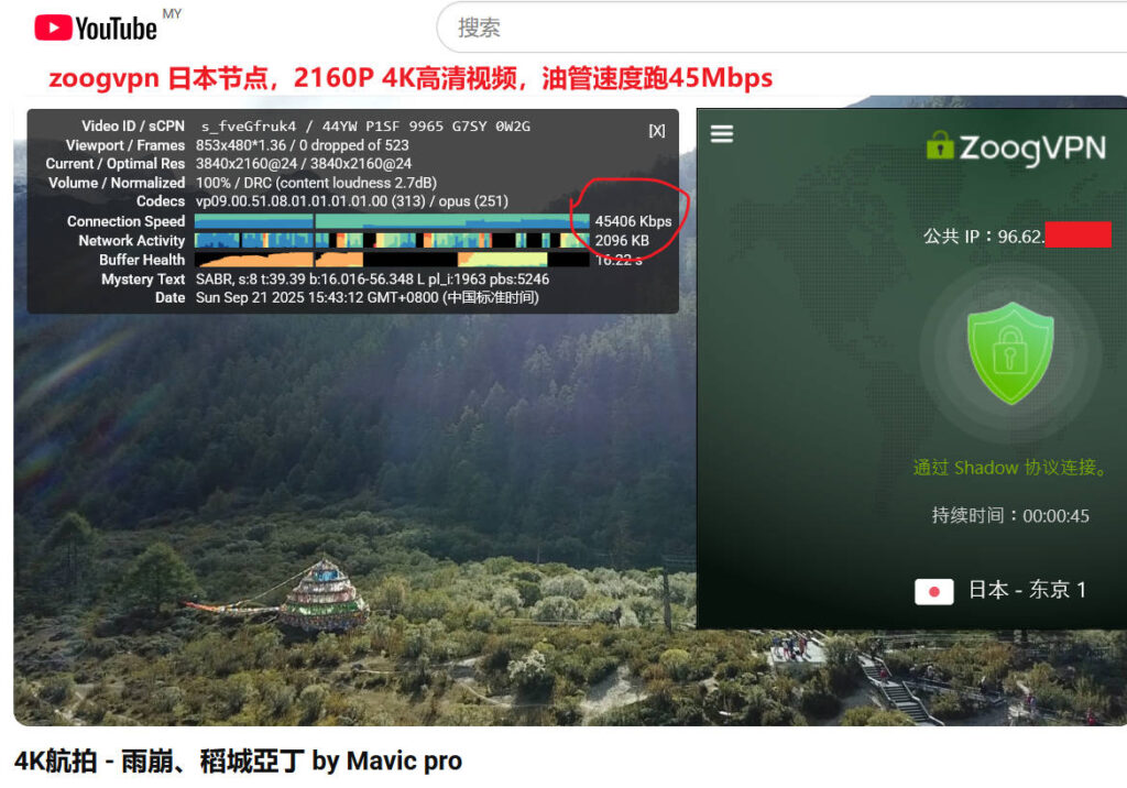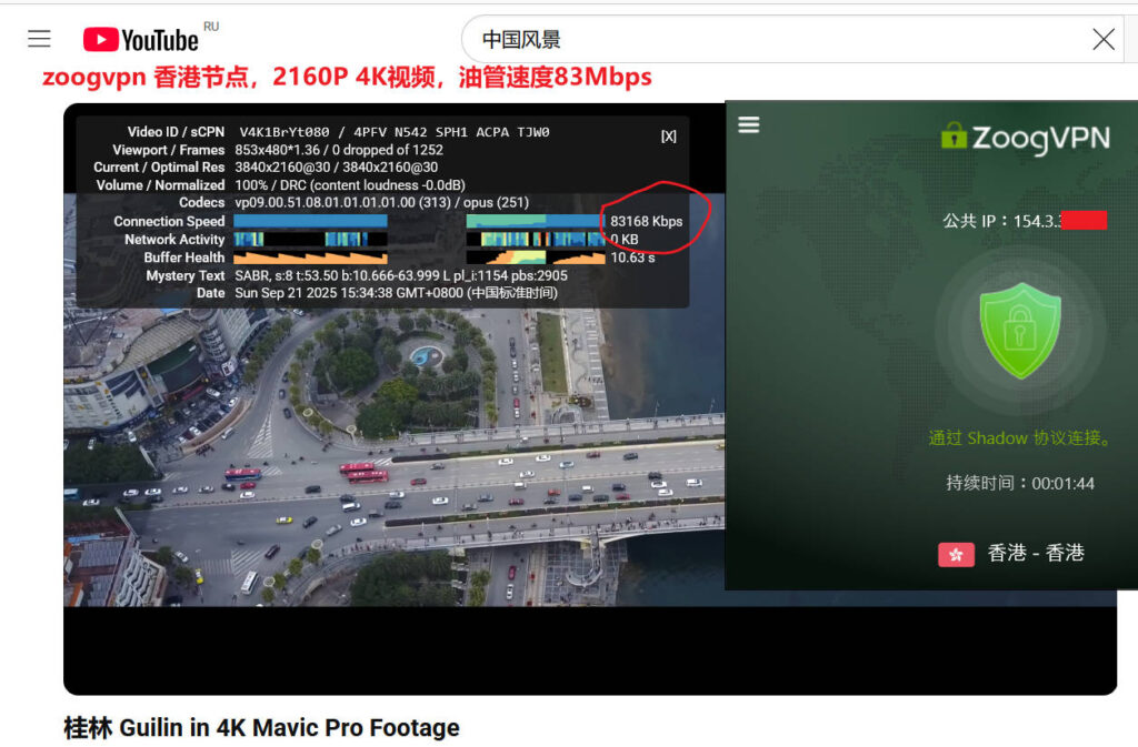 9月21日下午,电信wifi下,先后测试了韩国、香港和日本三个节点,连接协议都是默认的shadow协议,油管速度分别跑43Mbps、83Mbps 、45Mbps,其中香港和日本视频都选择的2160P 4K超高清视频,播放非常流畅!非常给力!如下图所示