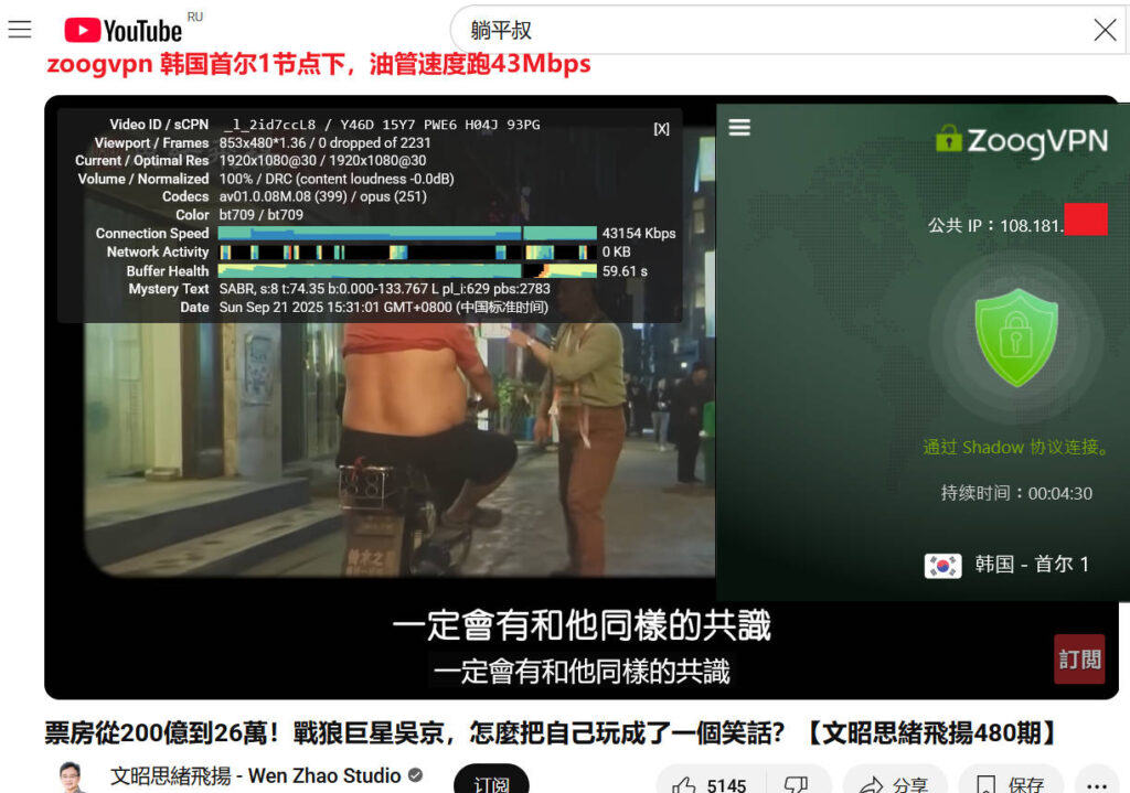 6月2日下午测试完电脑端的,再测试下手机端的。安卓上Zoogvpn app 上随机选择韩国首尔1、美国迈阿密节点,都是10秒内快速连接上,出来的还是shadow 协议,油管速度分别跑43Mbps(测试完退出后发现没截节点连接图,又重新连接截图)、和31Mbps, 速度表现还不错!手机上看油管视频非常丝滑!