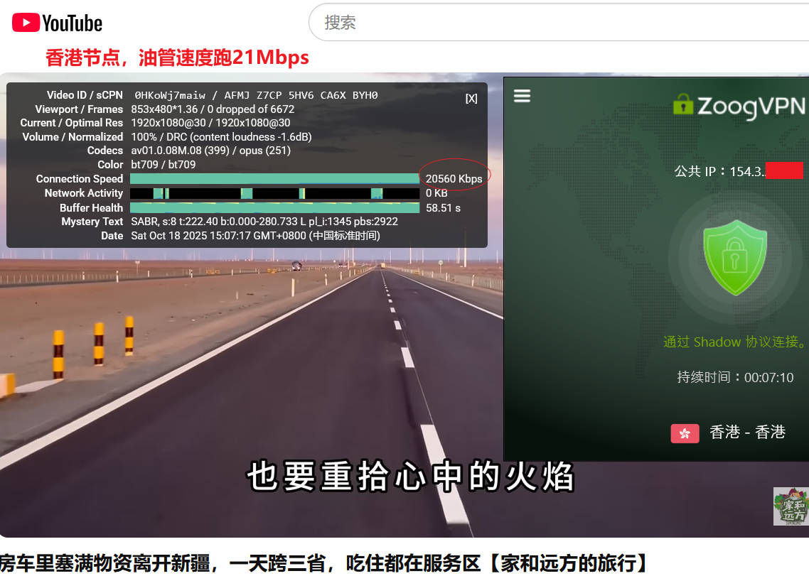 10月18日下午,电信wifi下,先后测试了韩国、日本东京和香港三个节点,连接协议都是默认的shadow协议,油管速度分别跑24Mbps、16Mbps 、21Mbps,如下图所示